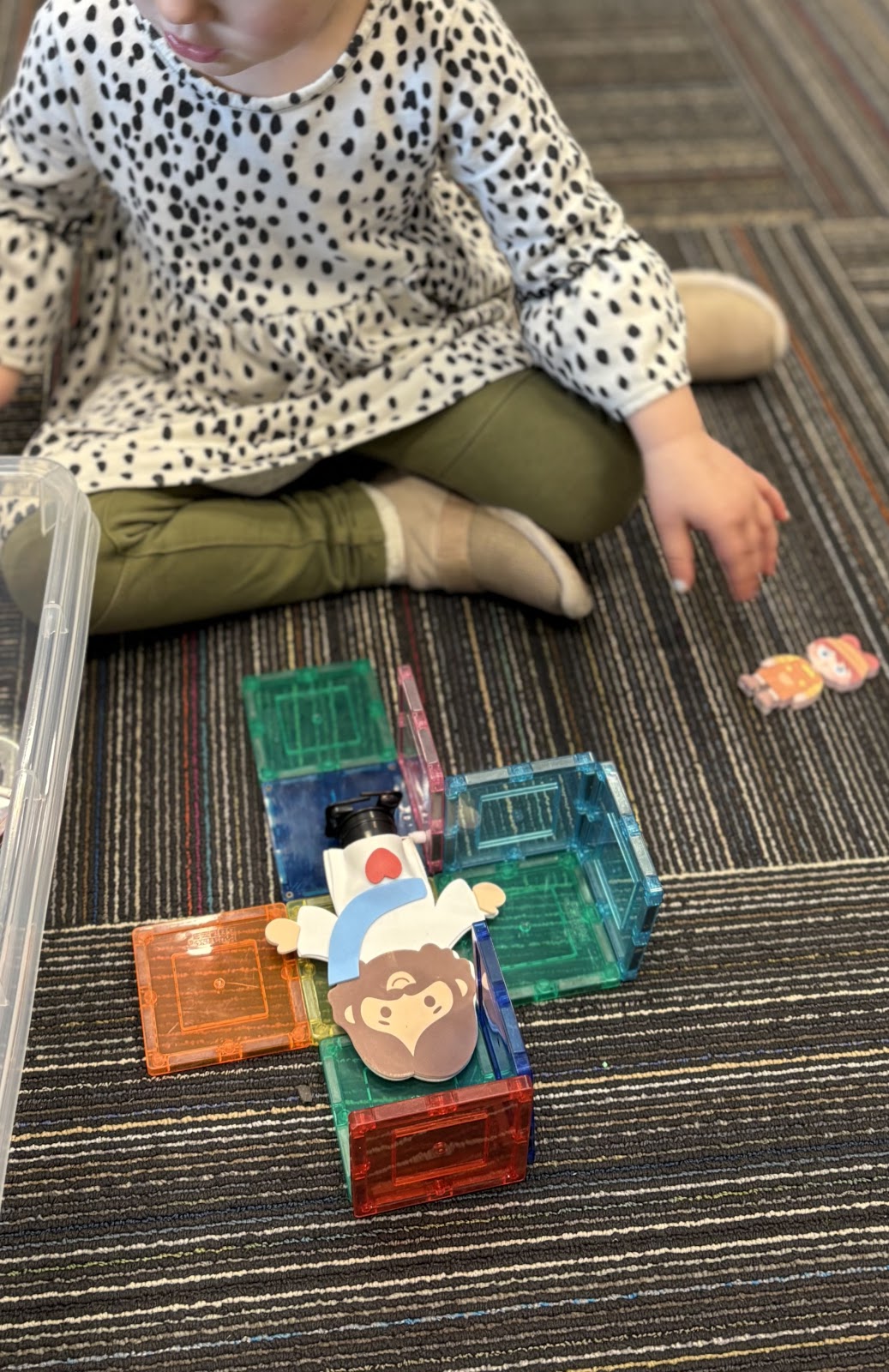 Then, a couple of the preschoolers created crosses from their Jesus toys out of magna-tiles and then entombed Jesus in the manga-tiles! Pretty soon all the kids were entombing their Jesus toys in the magna-tiles. It was fun watching them recreate the Easter story with their Jesus toys and seeing what parts stood out for them to remember. I definitely had the most enjoyable time watching as they broke their magna-tile tombs and wound up their Jesus toy rising Him from the dead!